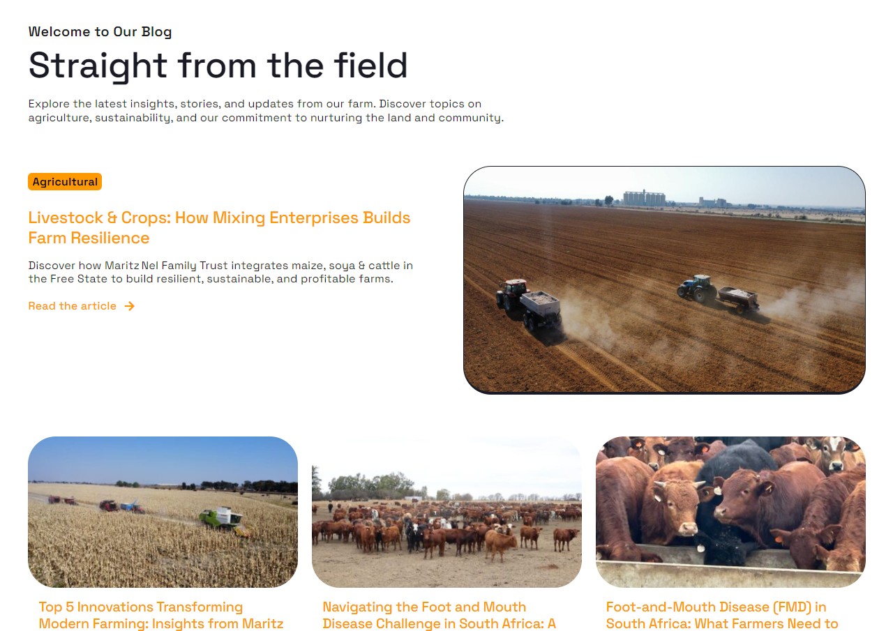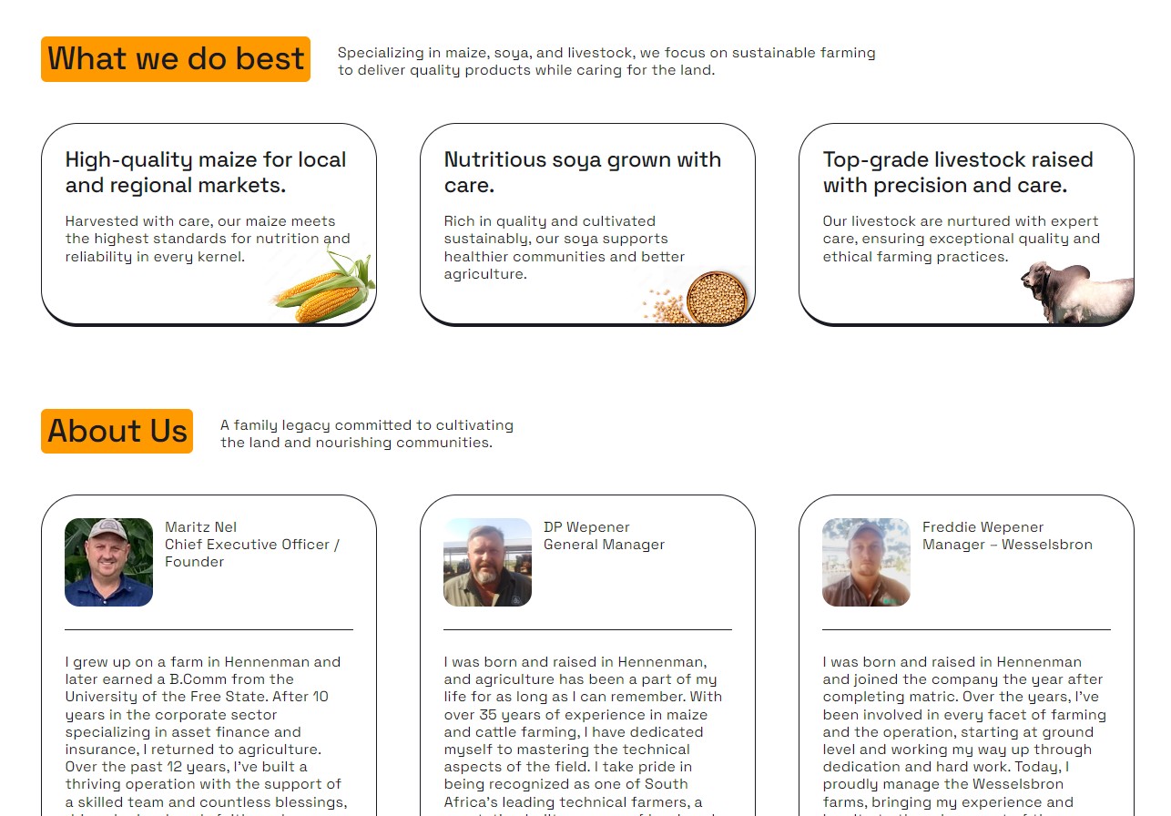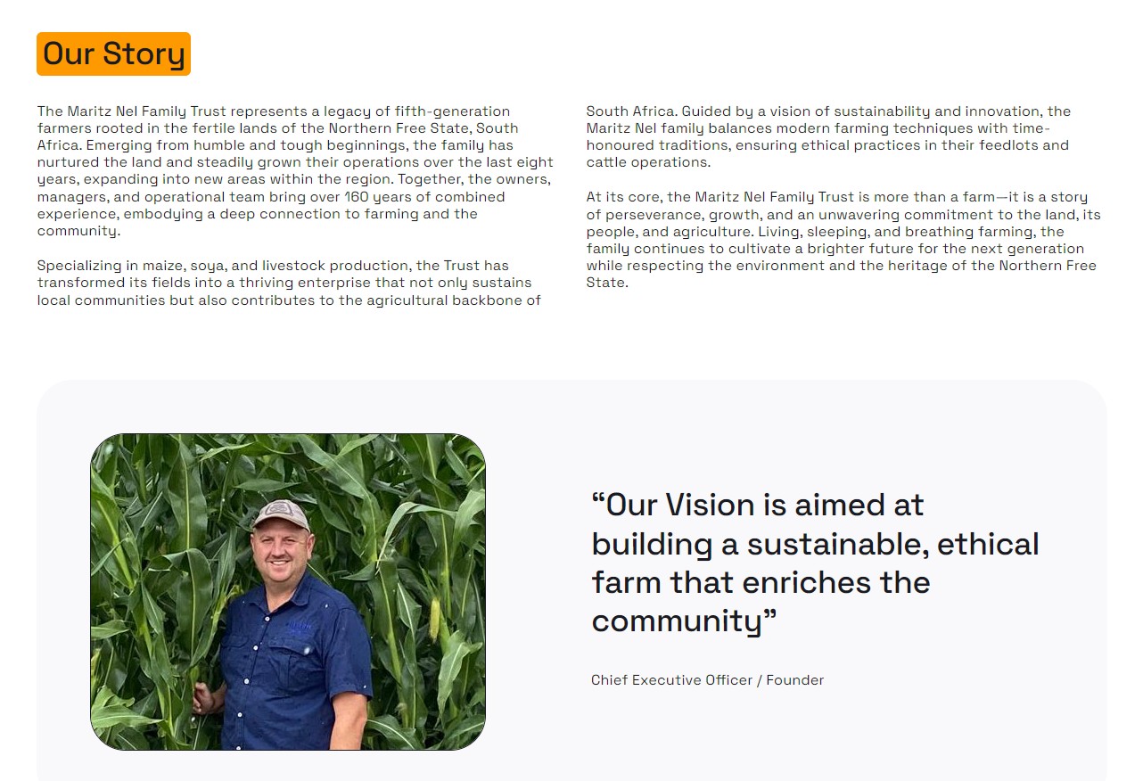 We had the privilege of working with Maritz Nel Family Trust to refine and restructure their online presence in order to reflect the full breadth of their farming operations: dryland maize, soya, livestock, regenerative practices and regional leadership in South African agriculture. The goal was to present a modern, efficient website that communicates their legacy, operations, sustainability focus and local importance — in a way that is easy for buyers, partners and stakeholders to engage with.