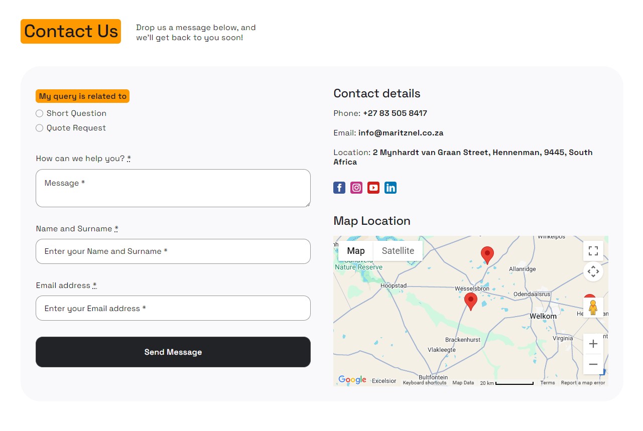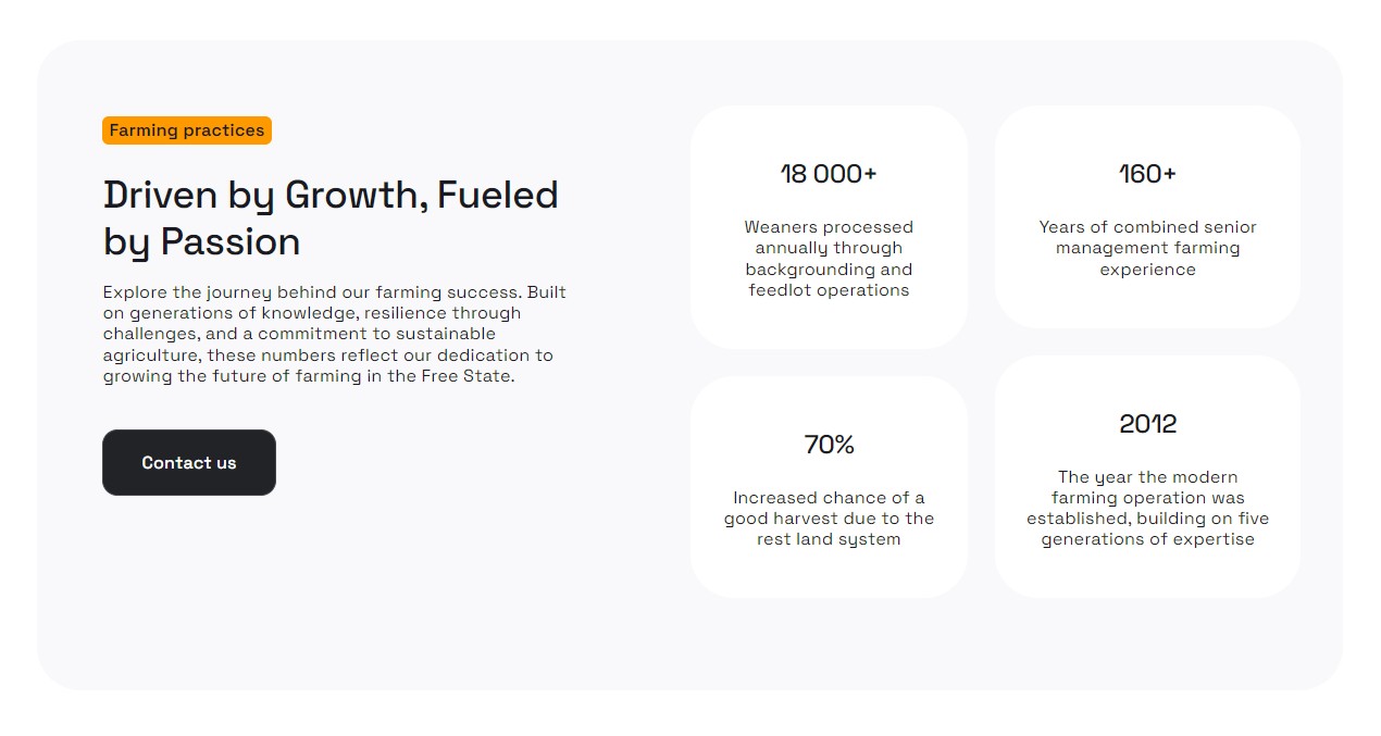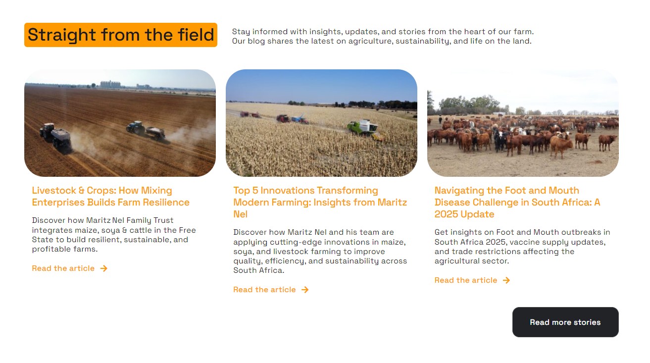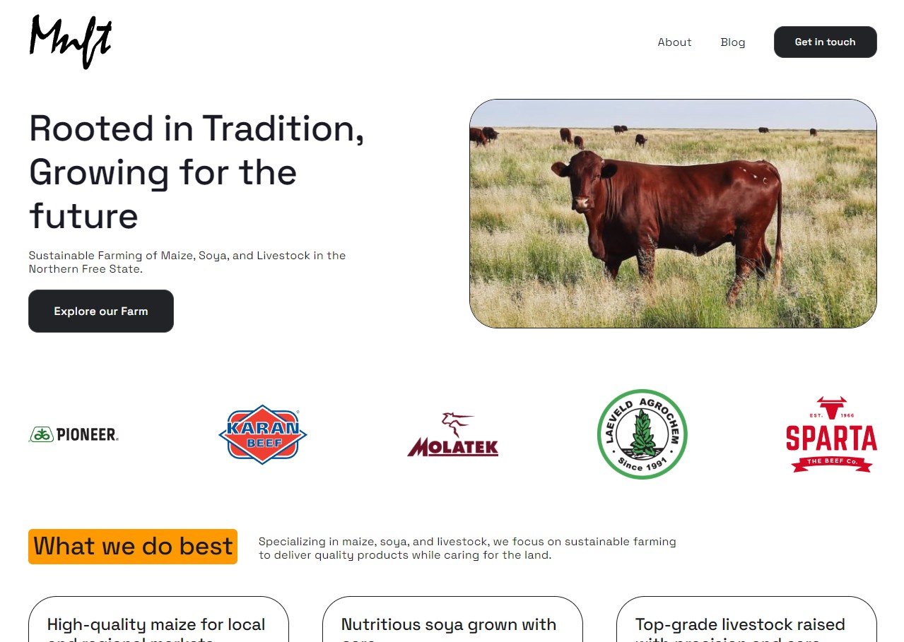 We had the privilege of working with Maritz Nel Family Trust to refine and restructure their online presence in order to reflect the full breadth of their farming operations: dryland maize, soya, livestock, regenerative practices and regional leadership in South African agriculture. The goal was to present a modern, efficient website that communicates their legacy, operations, sustainability focus and local importance — in a way that is easy for buyers, partners and stakeholders to engage with.